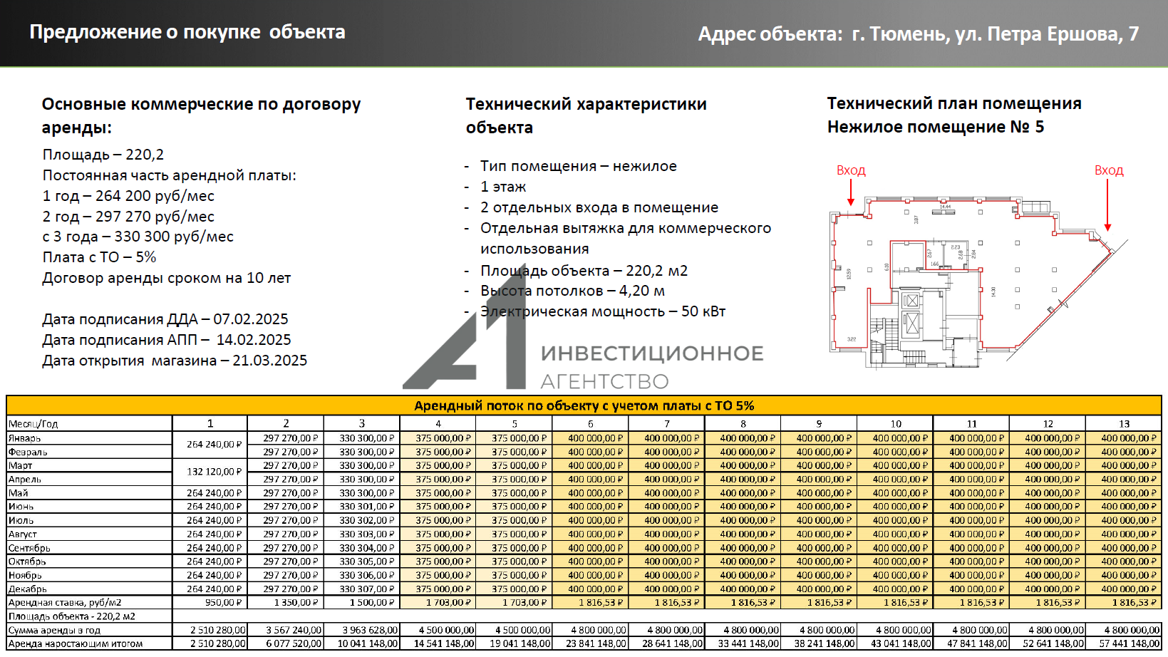 - предусмотрена оплата 5% от товарооборота - арендный поток будет стабильно увеличиваться при росте заселенности района;
