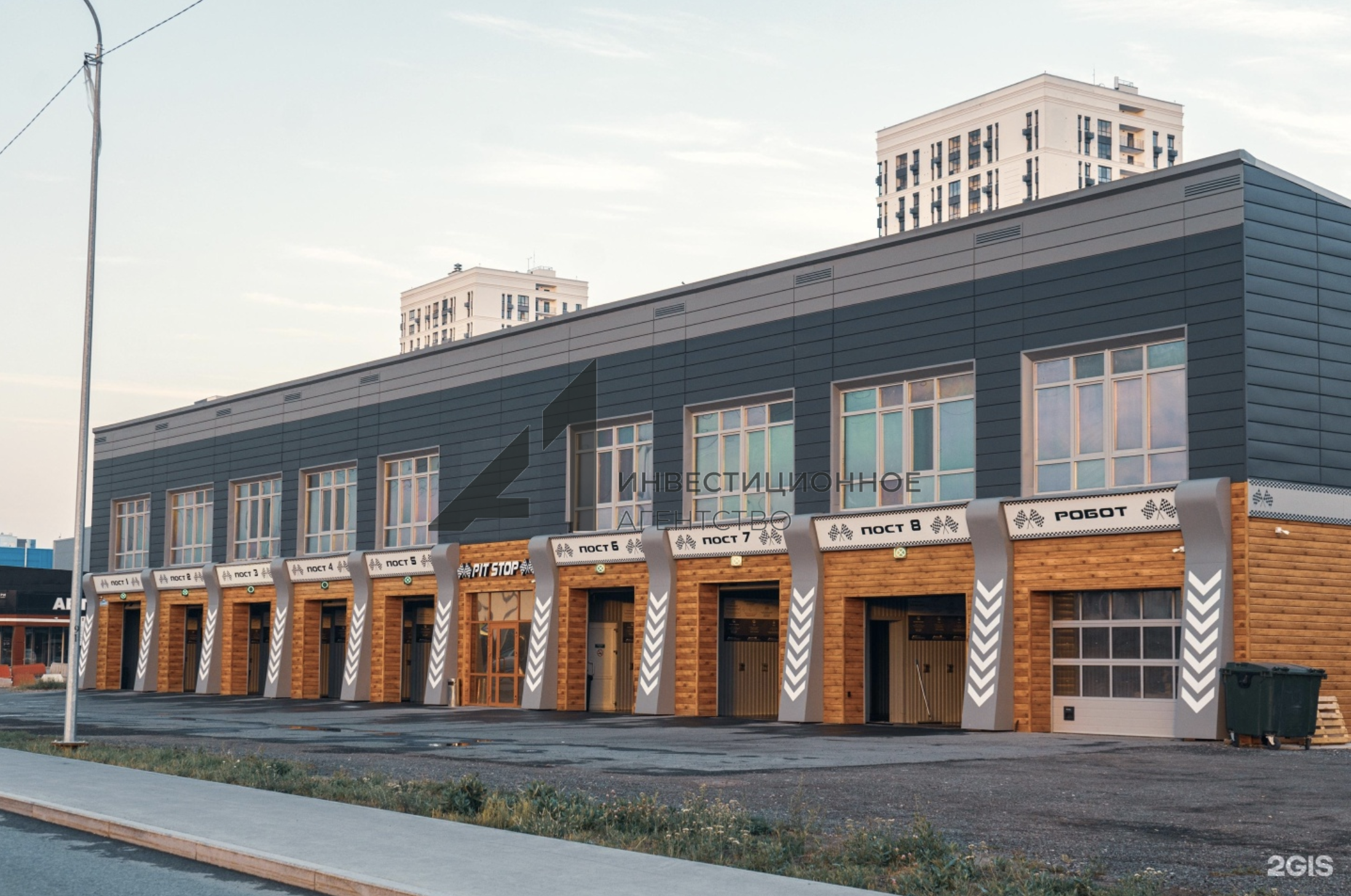 - на первом этаже автомойка “Pit Stop”, второй этаж - арена виртуальной реальности “ Первое Виртуальное”.